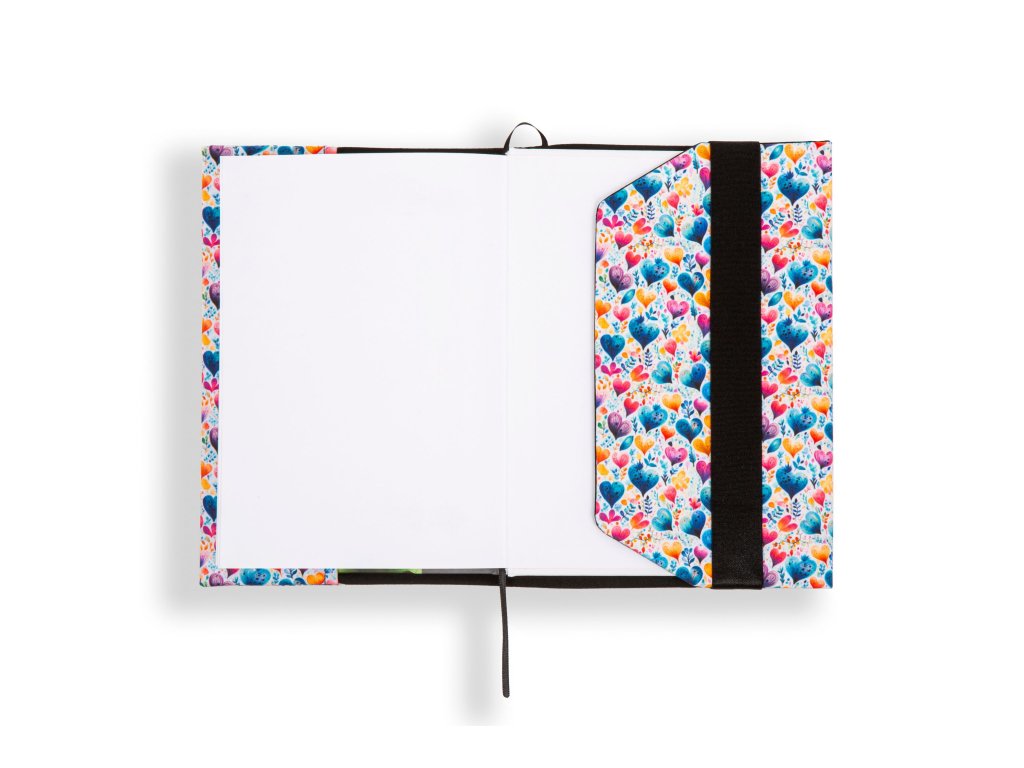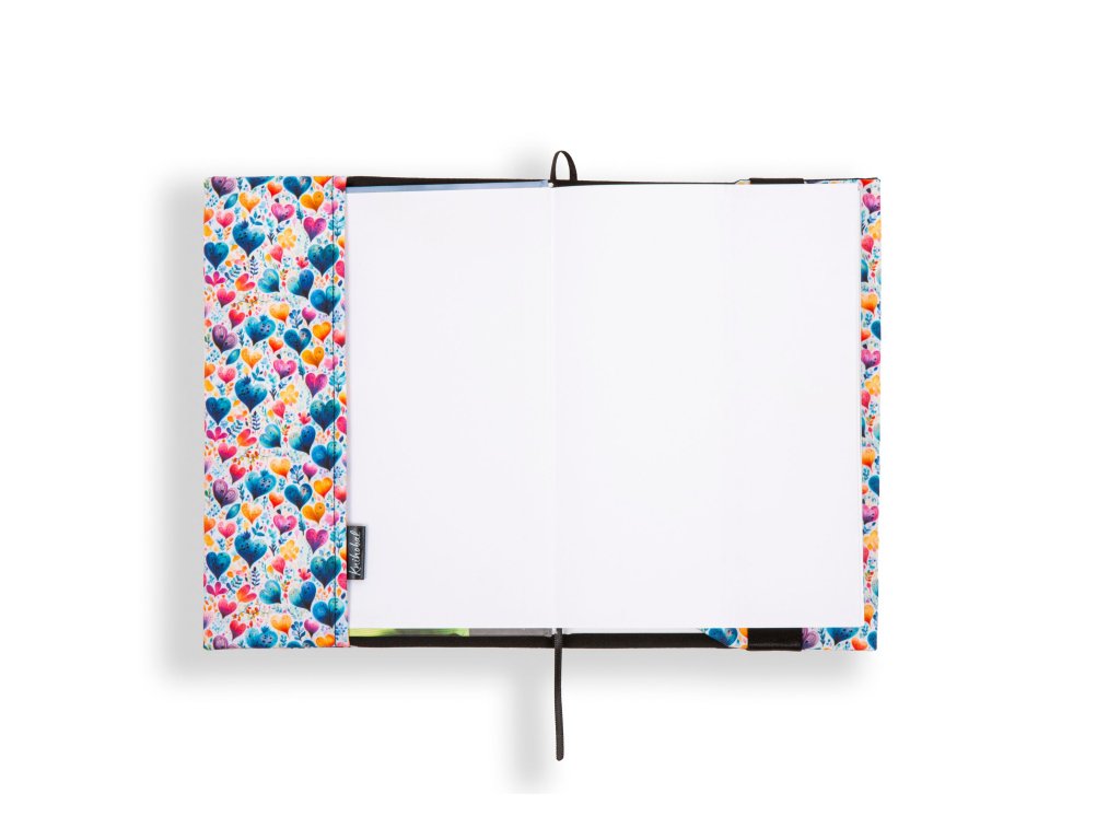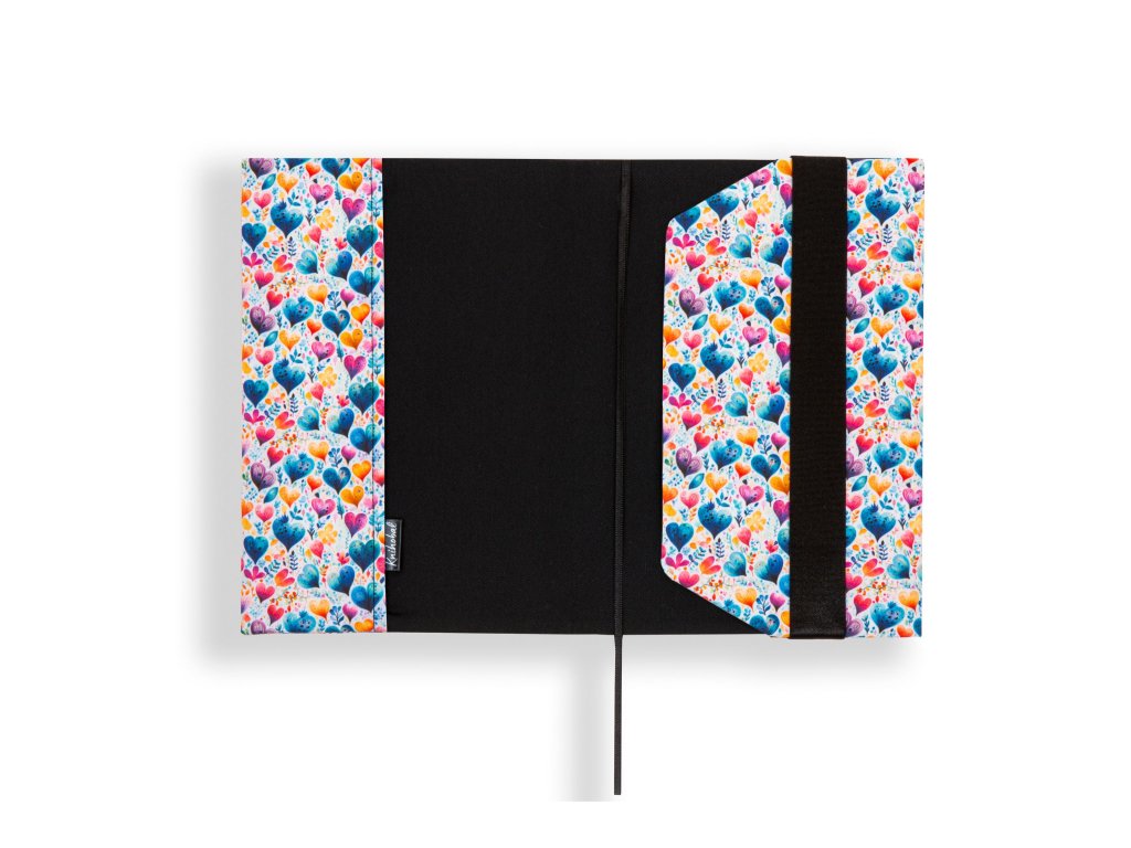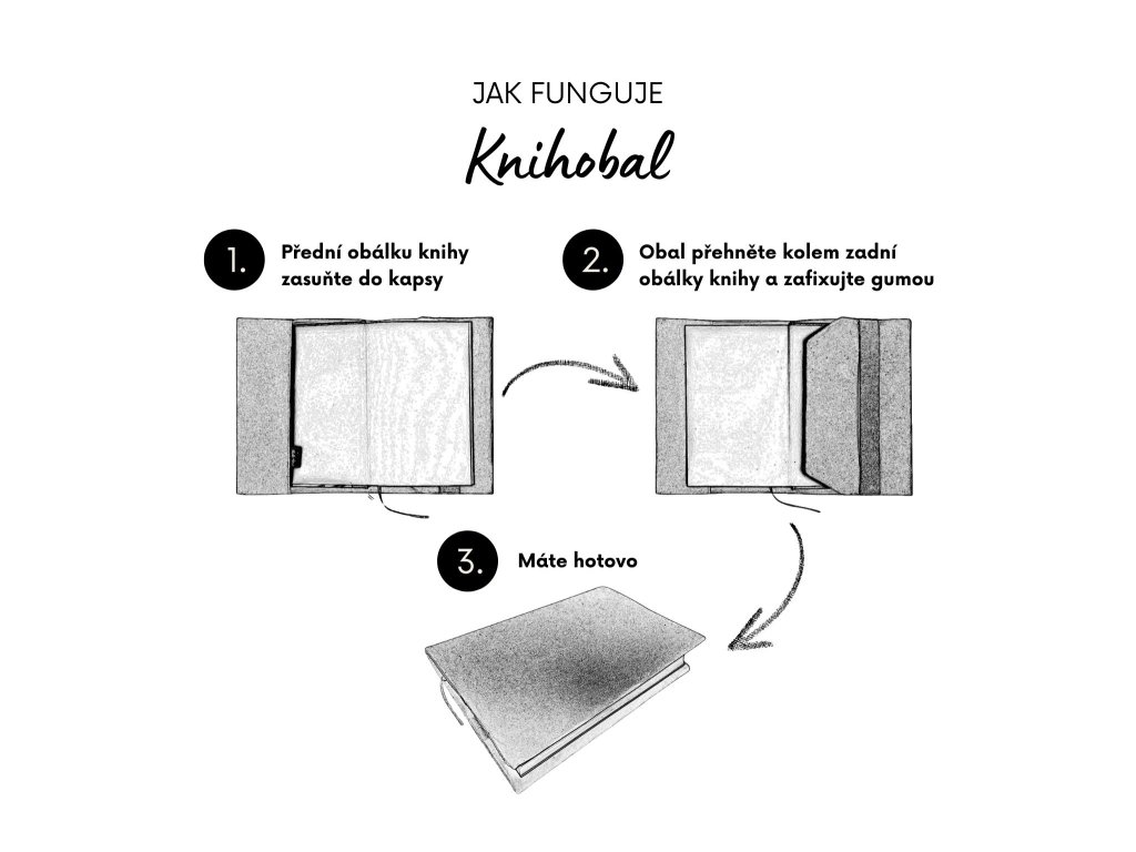 Knihobal má v levé části pevnou širokou kapsu, do které se zasune přední obálka vaší knihy. Vpravo se obal přehne kolem zadní obálky knihy a zafixuje se pomocí gumy tak, aby držela na místě, to znamená, že můžete změnit délku obalu v závislosti na tloušťce vaší knihy.
